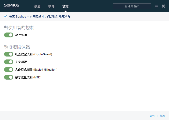 在移除Sophos InterceptX前,請透過主控台或端點程式內登入管理者設定,將【竄改防護】功能關閉。