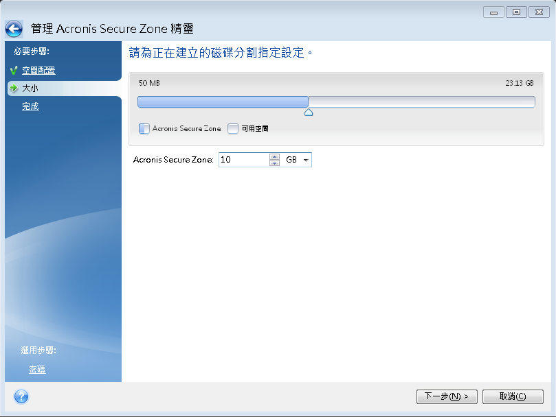 的資訊,同時也能將指定的備份存放到Acronis Secure Zone的位置。