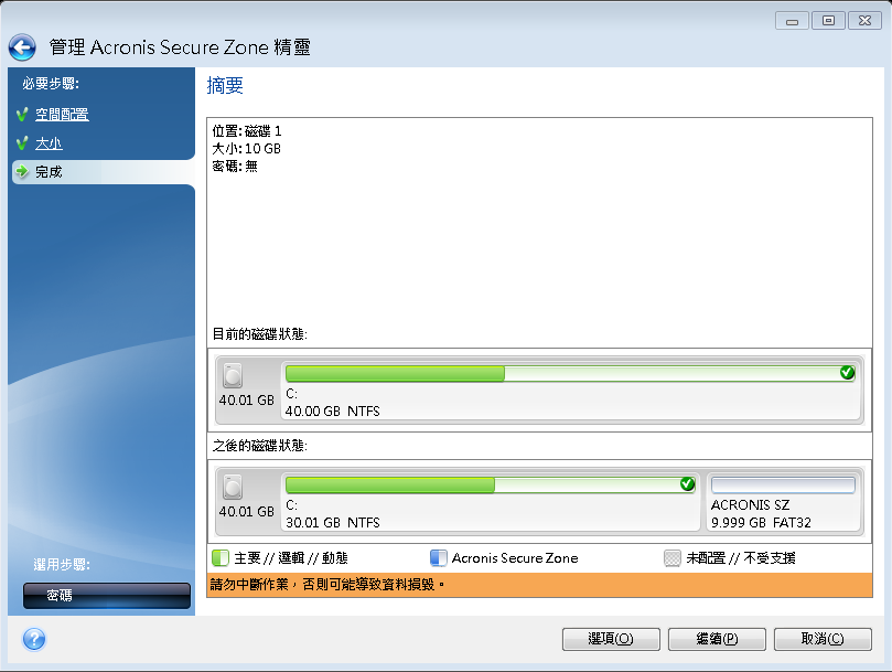:設定完成後即會顯示磁碟分割空間的資訊,請檢查設定是否正確,同時也可點選左下的【密碼】設定該分區的密碼,設定完成後,請點選【繼續】。